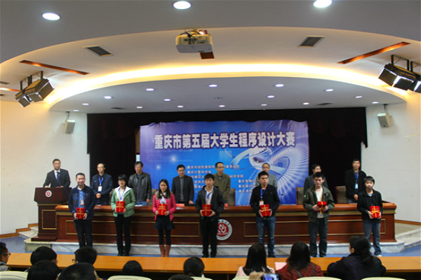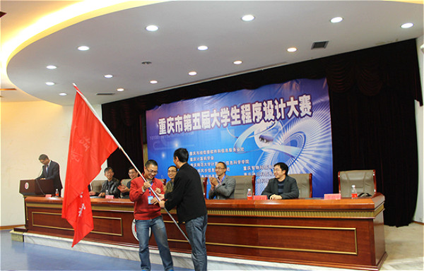 晚上7:00,在弘德楼凯撒学术报告厅举行了最激动人心的颁奖典礼。颁奖典礼的主持人为禁漫天堂党委副书记杨宇,出席颁奖仪式的领导和来宾有重庆市经信委软件和信息服务业处调研员王蓓,重庆计算机学会副理事长、我校研究生院院长马燕,重庆计算机学会秘书长、重庆大学计算机学院教授曾一,我校教务处副处长刘建银,禁漫天堂党委书记刘军,禁漫天堂副院长李世宏,禁漫天堂副院长杨德刚。在禁漫天堂党委书记刘军和重庆计算机学会副理事长马燕教授分别致辞后,由重庆计算机学会秘书长曾一教授宣布比赛获奖名单。此次大赛共评出三等奖34个团队,二等奖有13个团队,一等奖的6个团队,特等奖1个团队。另有优秀组织奖3个。颁奖结束后,我校承办代表李世宏教授将旗帜授予下一届重庆大学生程序设计比赛的承办方重庆工程电子学院的代表。