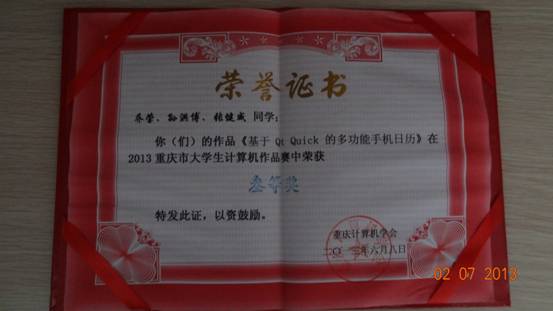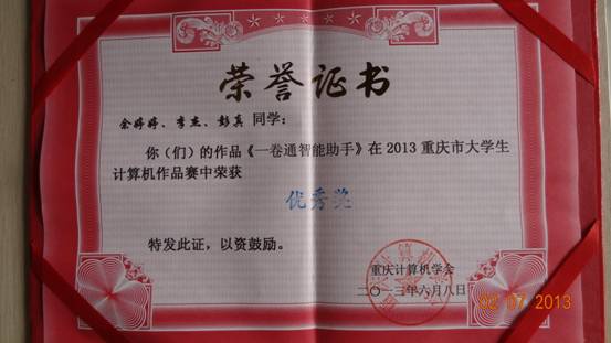2013年重庆市大学生计算机作品赛于2013年6月8日在西南大学拉开帷幕。本次大赛分两个阶段进行:初赛和决赛。初赛由各大高校内举行,经过激烈的角逐,禁漫天堂选拔出最优秀的参赛作品2项,分别是“基于Qt Quick的多功能手机日历”和“一卷通智能助手”。从初赛到决赛,学院给予赛前培训、实验室安排、交通补贴等支持。