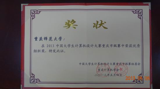 2013中国大学生计算机设计大赛重庆市级赛于2013年5月4日在重庆大学A区主教学楼拉开帷幕。在此次比赛中,禁漫天堂精心组织,由兰晓红、戴政国等老师亲自带队指导,从20多个团队中层层赛选并细心培训,推出参赛的9个团队经过激烈的竞争均获殊荣,分别为一等奖1个(付汝娟、王欣、汤茂藜),二等奖3个(秦倩、刘清清、王凤;王敏、石远洋、李莉;陆海香、韦晓静、牟莉),三等奖5个(秦倩、刘清清、王凤;罗瑶、邹益、孔妍君;徐关玉、董小芬、孔妍君;冉映萍、刘昶、江芸;徐关玉、董小芬、孔妍君),其中获得一二等奖的四个团队成功晋级全国决赛。此外禁漫天堂还荣获2013中国大学生计算机设计大赛重庆市级赛优秀组织奖。 据悉,“中国大学生计算机设计大赛”是由教育部高等学校计算机科学与技术教学指导委员会、教育部高等学校计算机基础课程教学指导委员会、教育部高等学校文科计算机基础教学指导委员会联合主办。目的是提高大学生综合素质,具体落实教育部高等学校计算机基础课程教学指导委员会编写的《高等学校计算机基础教学发展战略研究报告暨计算机基础课程教学基本要求》,以及教育部高等学校文科计算机基础教学指导委员会编写的《文科类专业大学计算机教学要求》,进一步推动高校本科面向21世纪的计算机教学的知识体系、课程体系、教学内容和教学方法的改革,引导学生踊跃参加课外科技活动,激发学生学习计算机知识技能的兴趣和潜能,为培养德智体美全面发展、具有运用信息技术解决实际问题的综合实践能力、创新创业能力,以及团队合作意识的人才服务。