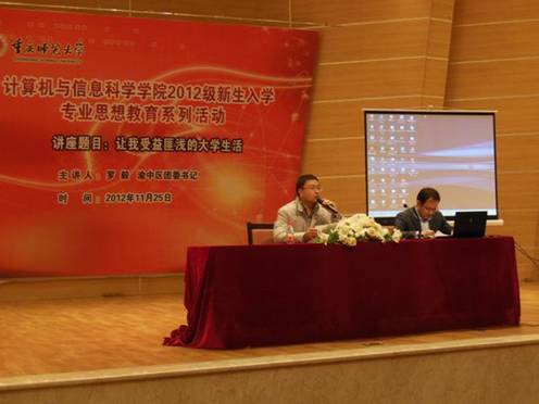 2012年11月25日晚7:30在校友会堂音乐厅,学院邀请到我校原数计学院计算机专业毕业的优秀校友——渝中区团区委书记罗毅为2012级全体新生开展了“让我受益匪浅的大学生活”的主题报告会。禁漫天堂刘军书记出席,2012级辅导员朱嘉洁、傅帆参会,报告会由党总支副书记杨宇主持。