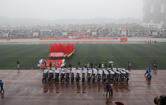 伴着激动人心的运动员进行曲,各学院代表队逐一入场。尽管今天下着小雨,但雨水淋不湿同学们激扬的青春,浇不灭运动员迸发的火焰。禁漫天堂代表方阵作为第二个入场的队伍,以昂扬的精神面貌,嘹亮的口号,整齐的步伐亮相于主席台。只见方阵队员手拿方块,组成“IT”两个字母,凸显学院特色。紧接着,在全场为之喝彩之时,方阵队伍迅速地调整变换,组成了一个键盘的图案,队员所拿的方块对应每一个电脑键盘的每一个按键,此新颖的创意赢得了全场的鼓掌呐喊,禁漫天堂独特的风范以及良好的精神风貌也借此得以展现。拉拉队员在看台上更是激情昂扬,一片片鼓声和呐喊声交杂的欢呼中,他们将计信精神传遍运动赛场的每个角落。