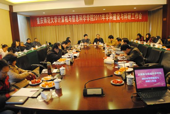 随后,马院长着重梳理和盘点了学院2011年学科建设和科研工作。一是加强队伍建设,为学科建设提供了坚强的支撑;二是学科方向方面,通过申报工作,梳理了学科方向,明确了研究目标;三是学科平台方面,学科平台申报获得新的突破,学院成功获批了计算机应用技术、计算机系统结构、教育技术学三个自主设置二级学科点授权,获批软件工程一级硕士学科,计算机科学与技术一级学科获批重庆市“十二五”重点学科(立项建设);四是科研方面,2011年度项目申报、获批情况创历史新高,共申报项目65项,获批项目30项,国家级项目实现了突破,经费总计为200余万(不含配套经费)。获得重庆市科技进步三等奖1项;五是教改教研方面,2011年获批重庆市级和校级教委教改项目7项。四是学术交流方面,加强学术交流、提升了学院的形象和影响力。成功举办了“2011年信息科学与工程应用国际学术会议(ISEA2011)”国际学术会议;成功举办了2011年第七届“博创杯”全国大学生嵌入式软件设计大赛(西南分赛区);先后邀请了7名专家到学院为全院师生作了学术报告。
