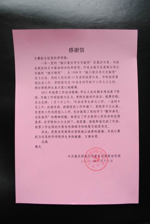 禁漫天堂收到校党委宣传部关于2011年度“振兴重庆争光贡献奖”统票工作的感谢信