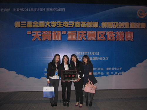 近日,禁漫天堂2009级电子商务专业4名学生——陈菲、付苇、谭玲和陈正连,参加了由教育部高等学校电子商务专业教学指导委员会主办、西南财经大学承办的第三届全国电子商务“创新、创意及创业”挑战赛(“三创赛”),并在2011年11月5日于分赛区主办方——重庆邮电大学喜获“三创赛”重庆赛区选拔赛二等奖的佳绩。