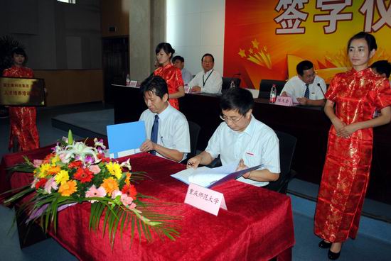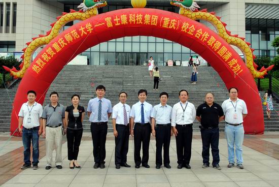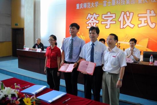 2011年6月22日,我校计信学院与富士康科技集团(重庆)的校企合作签约仪式在图书馆陈性初报告厅举行。教务处、学生处、计信学院学院相关负责人以及重庆富士康科技集团(重庆)信息中心(软件研发中心)副总经理高世忠、陈彦志副理和人力资源部资深经理江鸿铭、姜巧林专理等领导出席了本次签约仪式。仪式由计信学院党总支书记刘军主持。