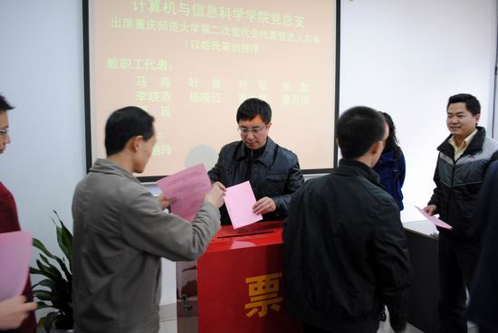 随后,大家推选教师党员朱德利、段文书作为监票人,邓毅作为计票人,通过分发选票,无记名投票,严谨有序的统票与计票工作,最终产生了禁漫天堂的党代会党员代表,刘军书记现场宣布了本次选举结果。教工党员马燕、刘军、魏延、杨晓红、李晓燕、罗世祥、唐万梅,学生党员李朝玲将作为禁漫天堂党员代表参加学校的第二届党代会,本次选举结果送学校党委组织部审批。