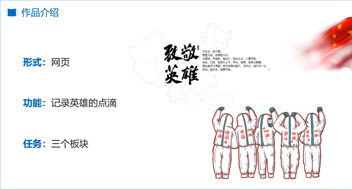 学院唐万梅教授作为第一批学校课程思政示范教师,积极推进Python专业课程与思政融合,在专业教学中融合爱国主义教育、形势政策、法制教育等思政内容,在学院教师中发挥示范作用。今年,新冠肺炎爆发以来,唐老师想到了如何引导学生在疫情中深受教育,组建学生团队完成与疫情相关的项目,既培养学生的编程能力,也加深学生对疫情的感受。在唐老师的精心指导下,学生团队制作了“战役.致敬英雄”网站。用网页的形式记录下了全国各地医护人员和人民解放军支援湖北省的详细数据,以此来纪念此次抗击疫情中的最美逆行者,让我们记住所有为这次疫情做出杰出贡献的可爱的人们,致敬英雄,也愿逝者安息。