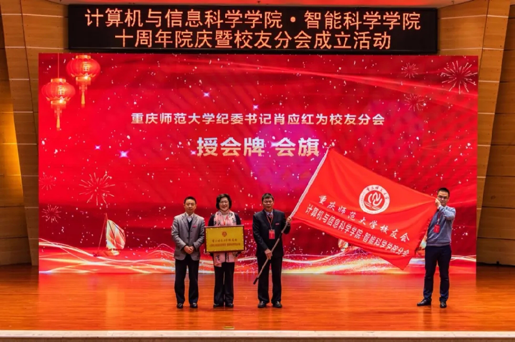 纪委书记肖应红、校友总会秘书长李科相继上台为校友分会第一届理事会颁发聘书,为分会授会旗、会牌。