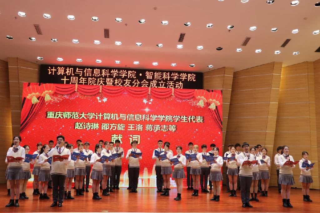 接下来,学生代表上台献词,计信学子声情并茂地表达了学院的深情与祝愿,博得台下阵阵掌声。紧接着,2012级计算机科学与技术专业学生刘玉立作为毕业生代表表达了对学院领导老师悉心培育的感激之情以及对学院未来发展的美好憧憬。重庆计算机学会秘书长曾一教授、南京师范大学计算机与电子信息学院院长吉根林教授、腾讯教育高校产品总经理钱栩磊先生上台致辞,表达了对计信学院十年生日的祝福,并表示将加深校企合作,助推学院发展。同时,禁漫天堂也收到了来自南京师范大学计算机与电子信息学院与中渝智能设备(重庆)有限公司赠礼。