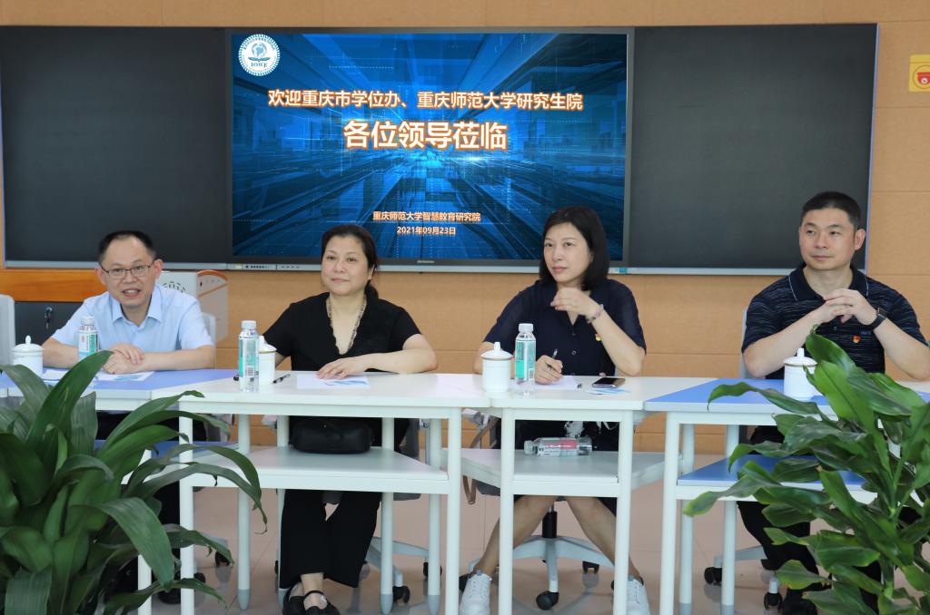 实验室考察结束,在研究院的智慧研讨室举行了由市学位办、学校研究生院和智慧教育研究院的共同参加的研讨会议,会议上,市学位办领导介绍了目前全国学科建设情况,重庆市在十四五学科建设的思路与举措,大家就如何推进高校学科建设、打造特色和亮点等问题进行了研讨的交流。